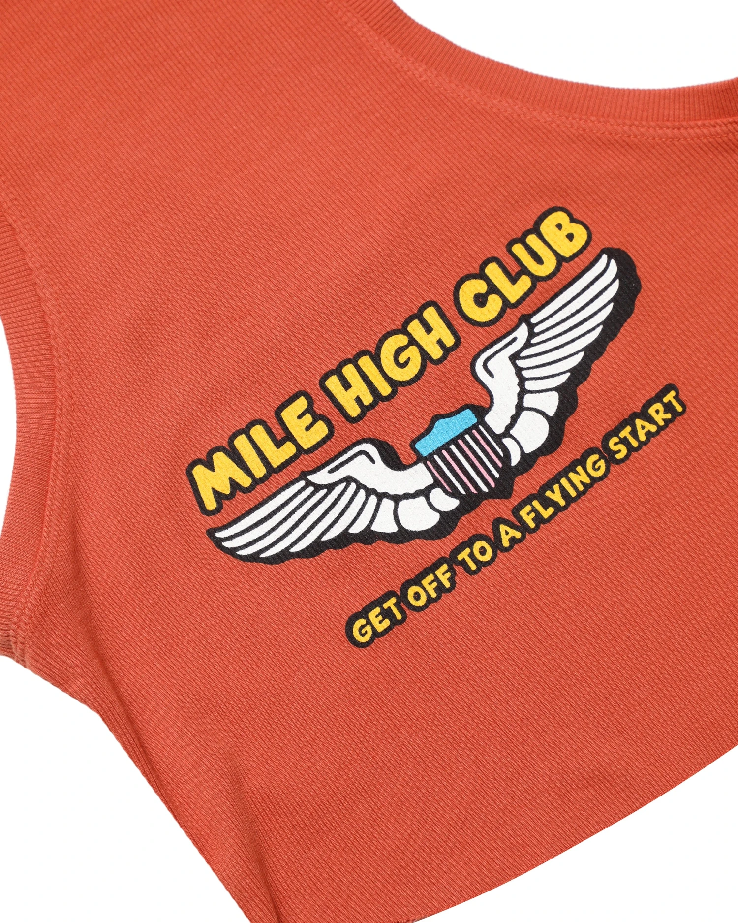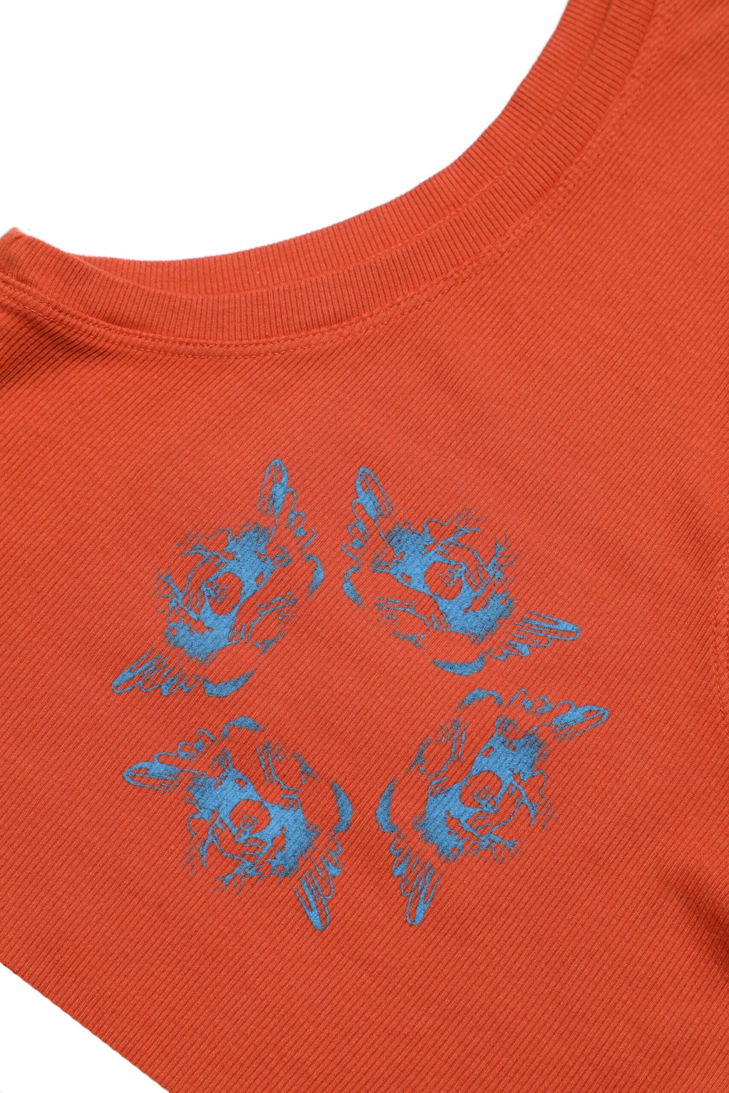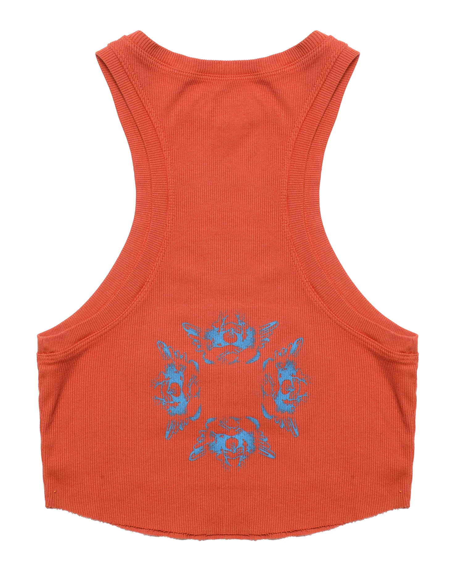 Ribbed crop tank in terracotta red. Curved hem with a raw edge and racerback neckline. Logos printed with vintage effect.Â