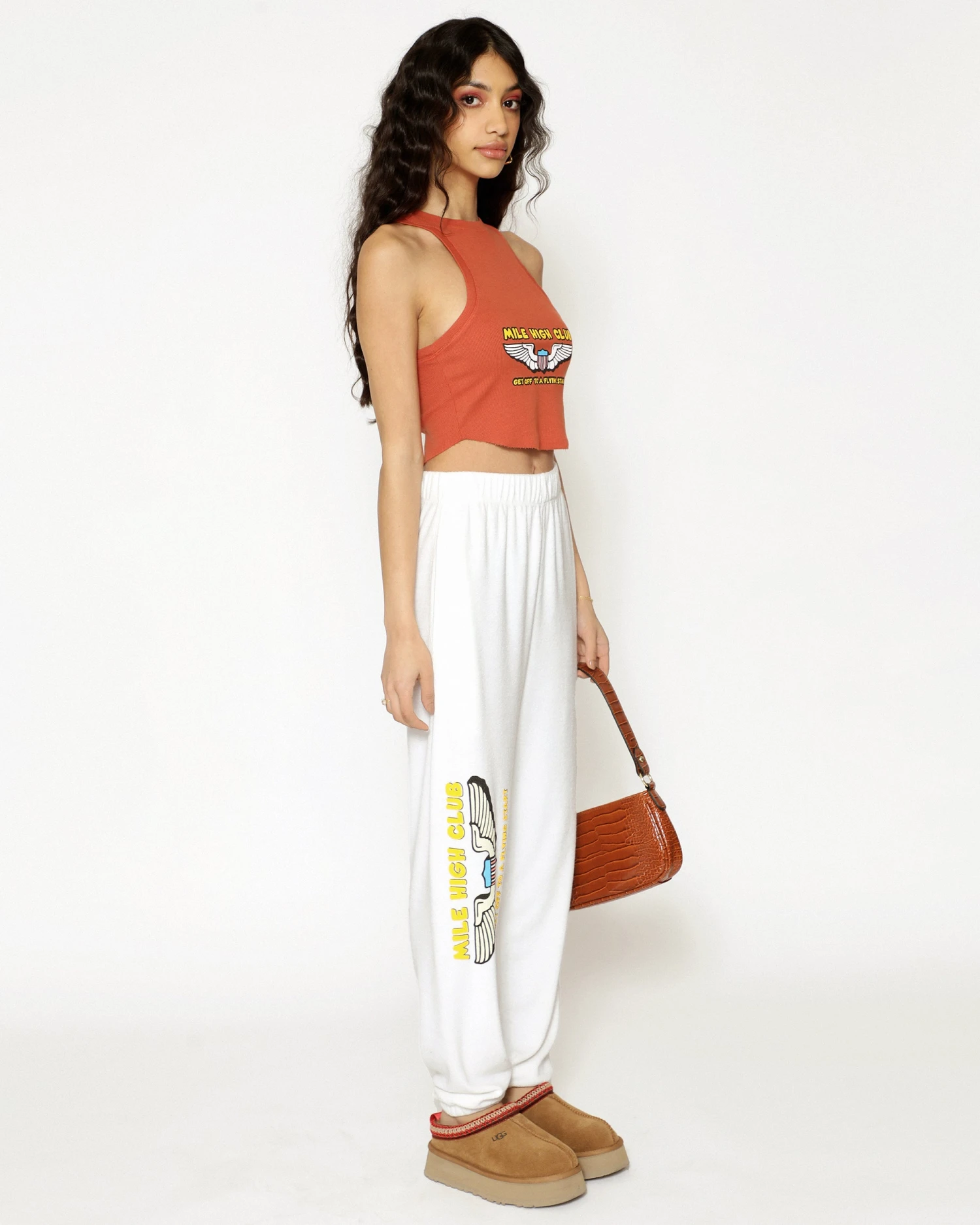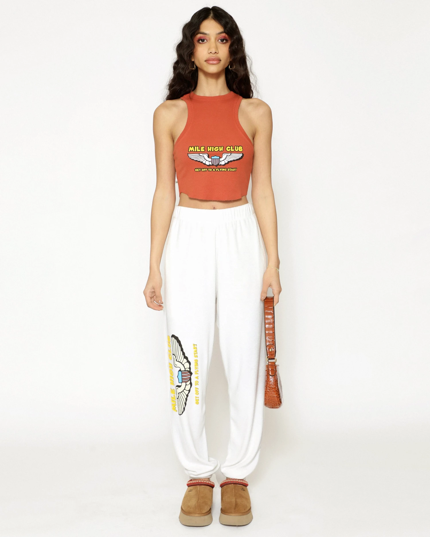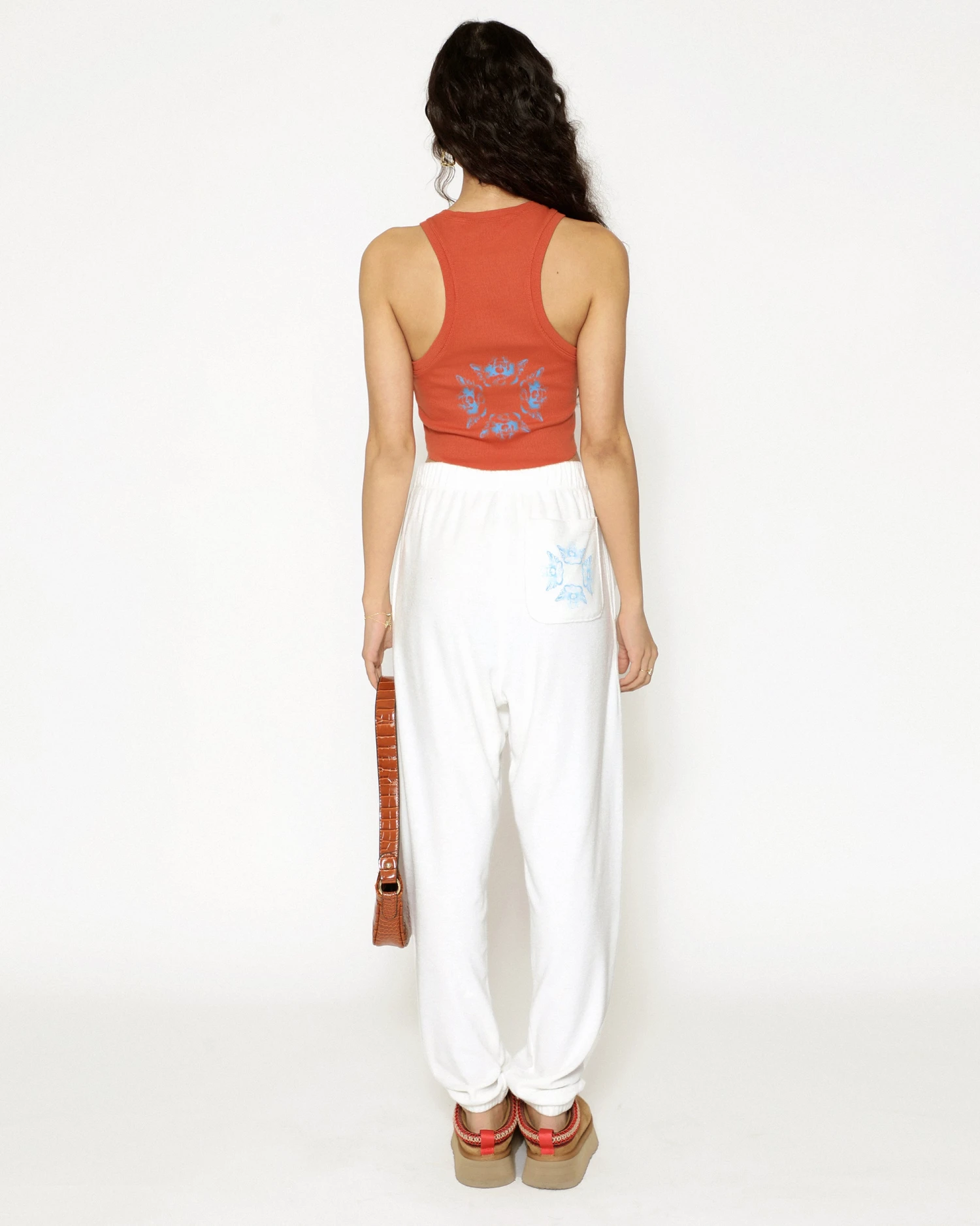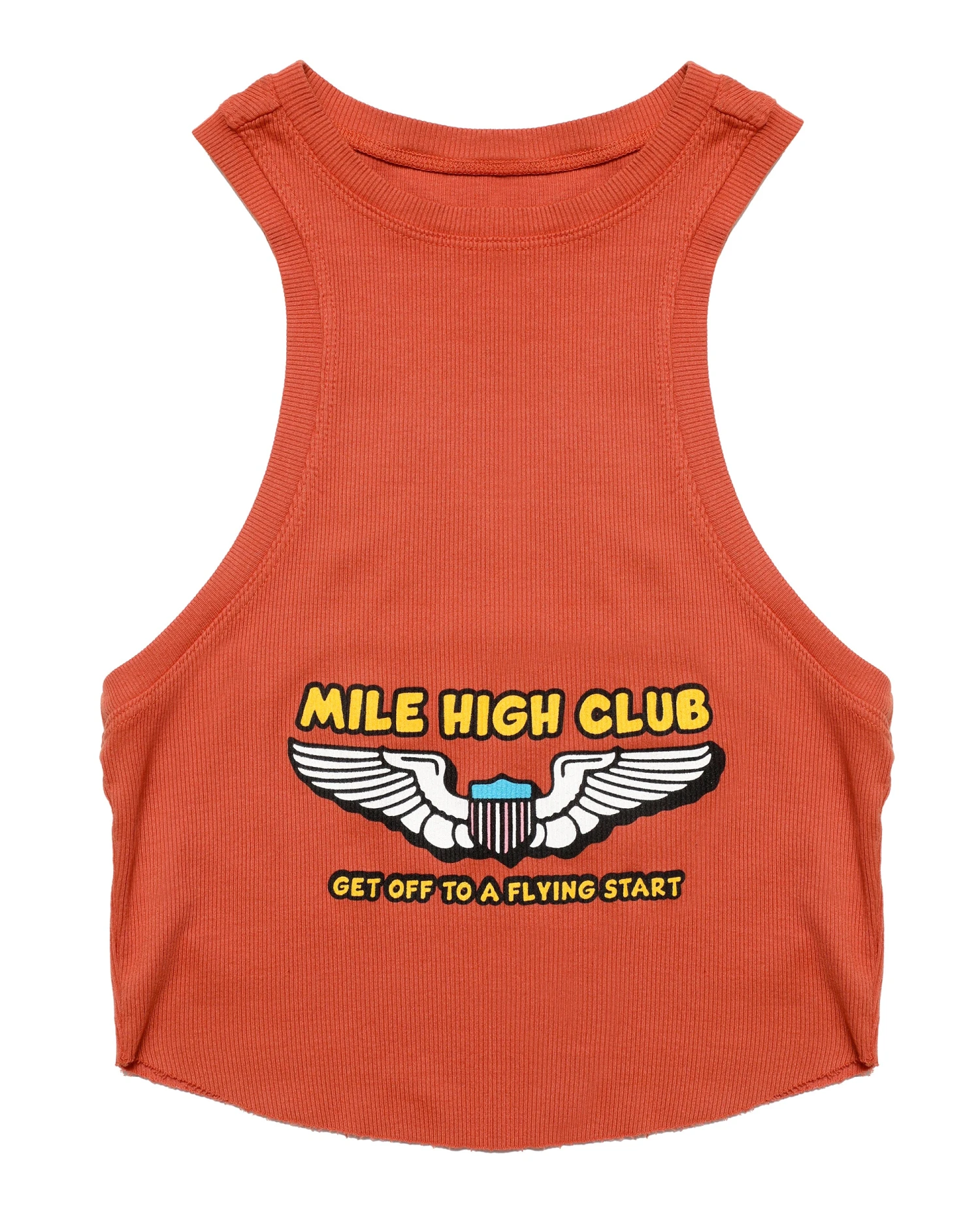 Ribbed crop tank in terracotta red. Curved hem with a raw edge and racerback neckline. Logos printed with vintage effect.Â