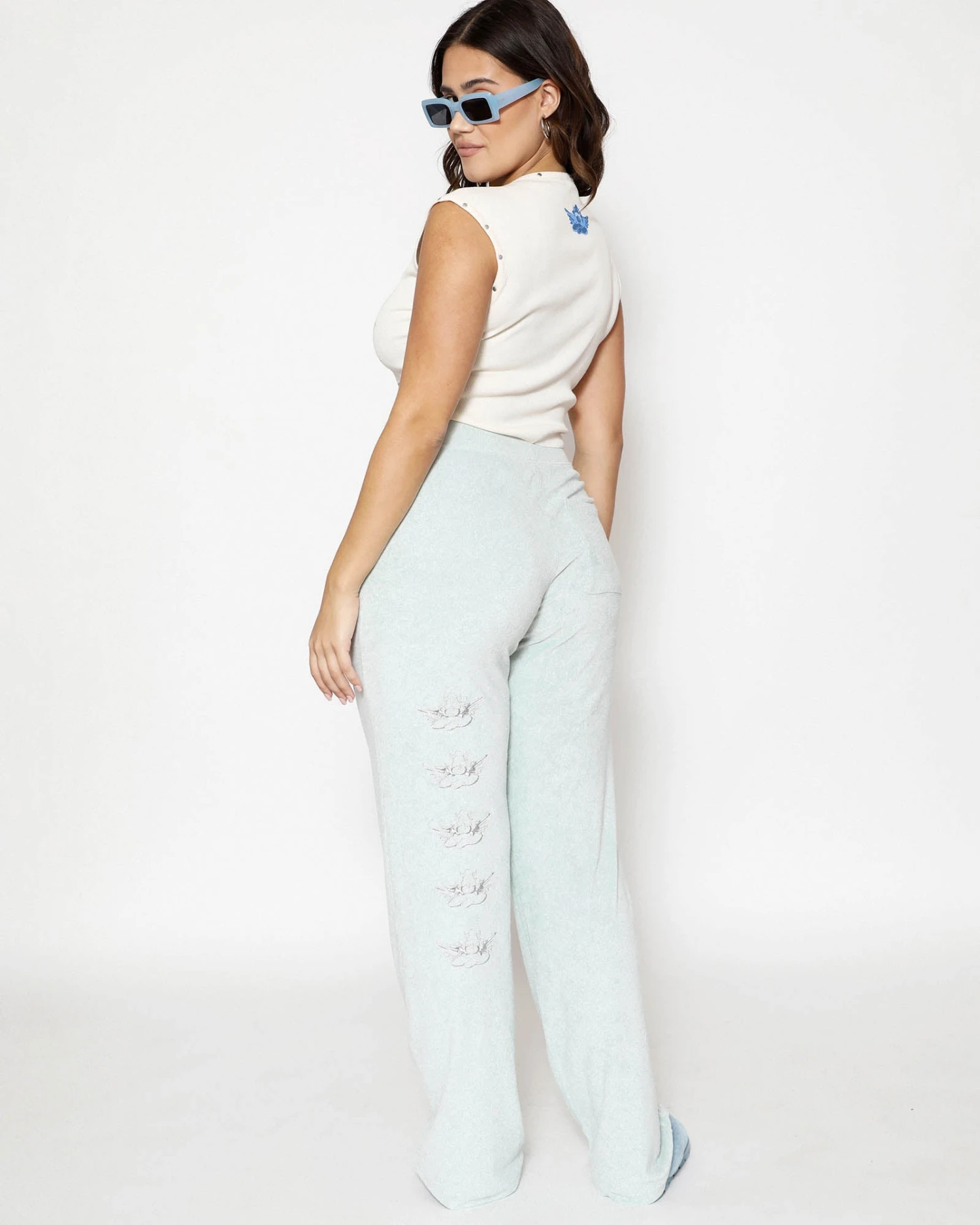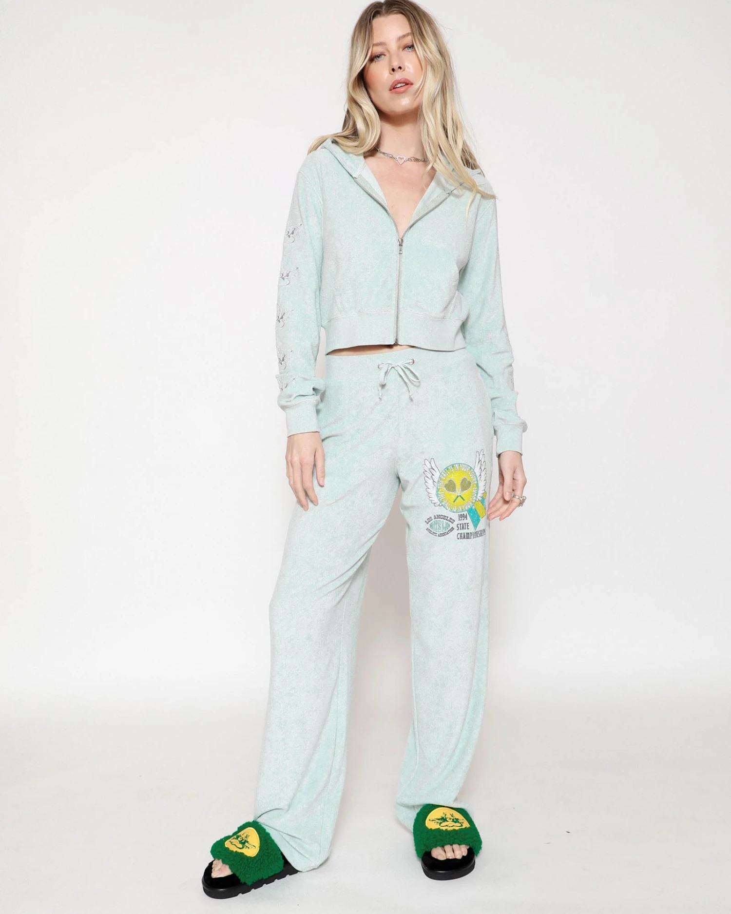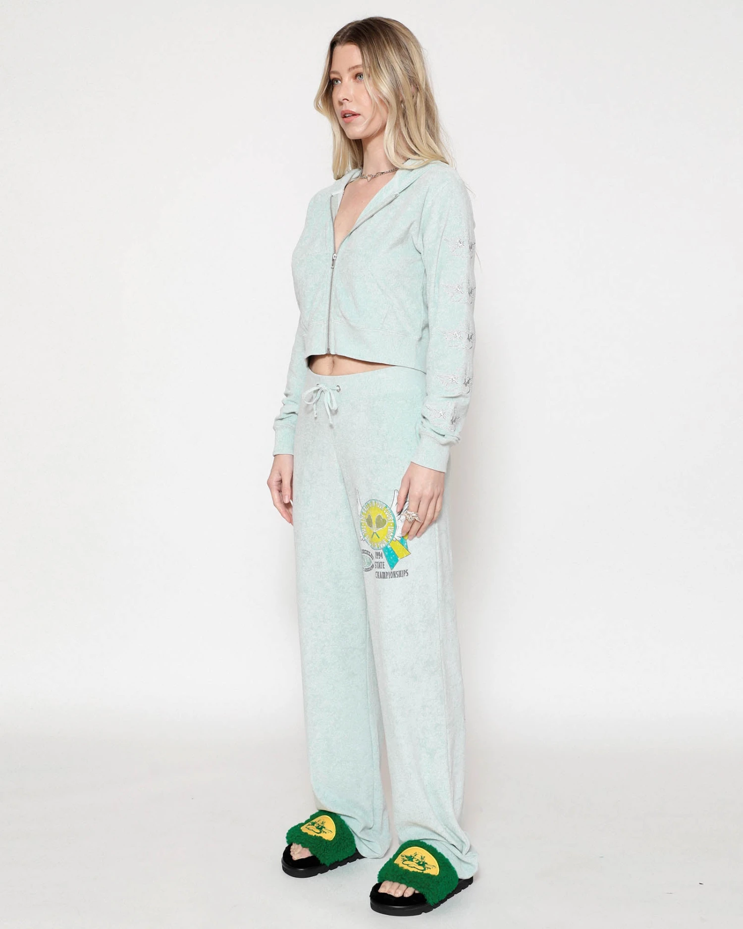 Lightweight terry cloth fabric in light blue-green. High rise sweatpants with side pockets, a drawstring waist, and straight leg with long inseam. Features metallic embroidery down the legs.Â