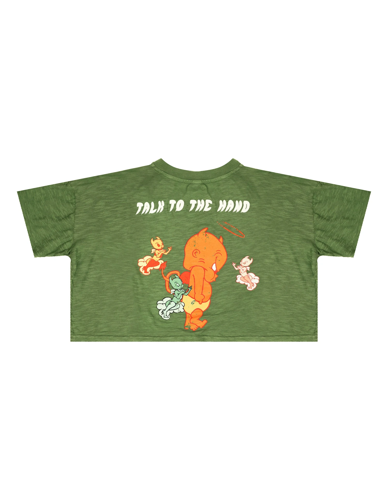 Cotton slub cropped baby tee in green. Lightweight and slightly sheer with distressed graphics.Â