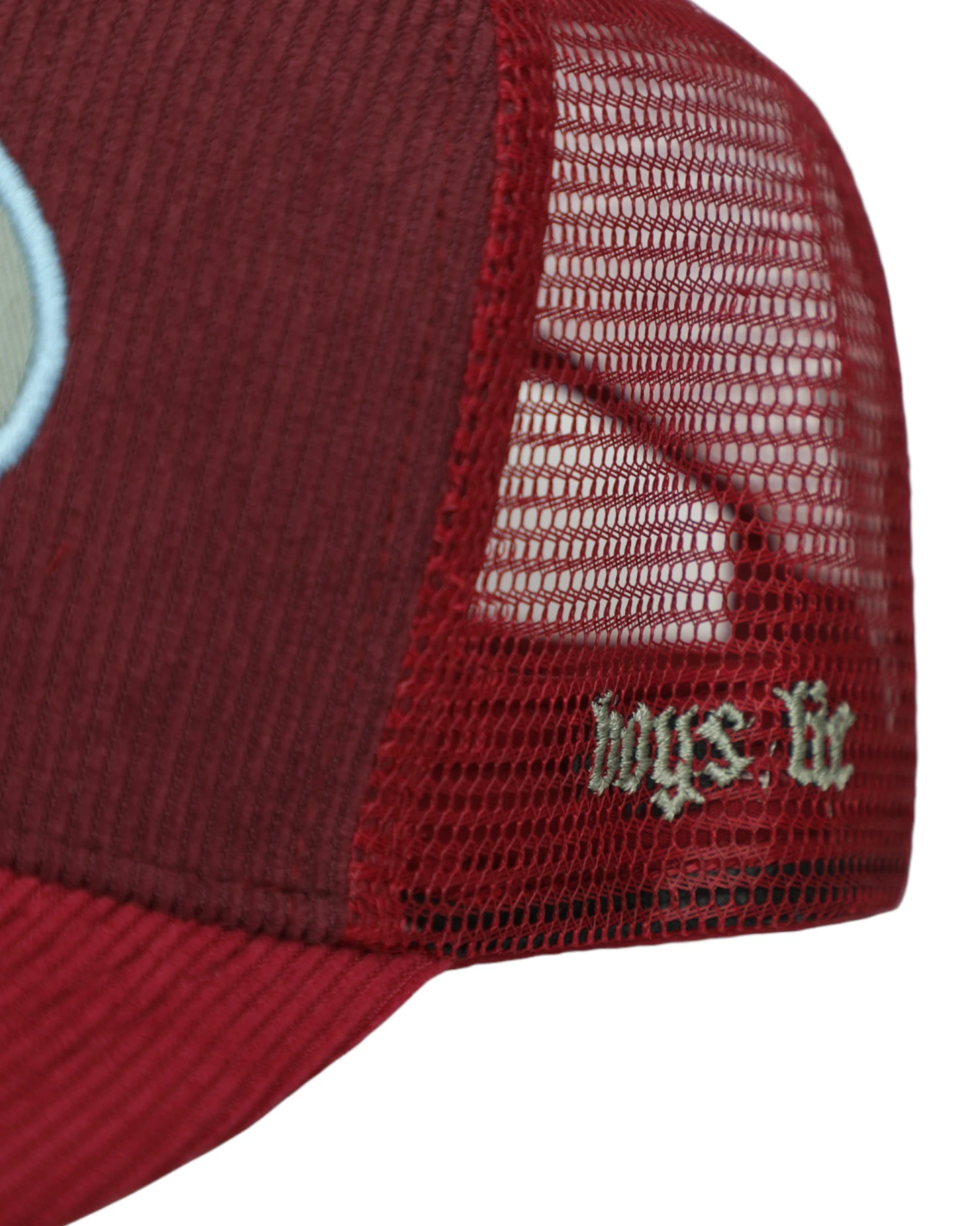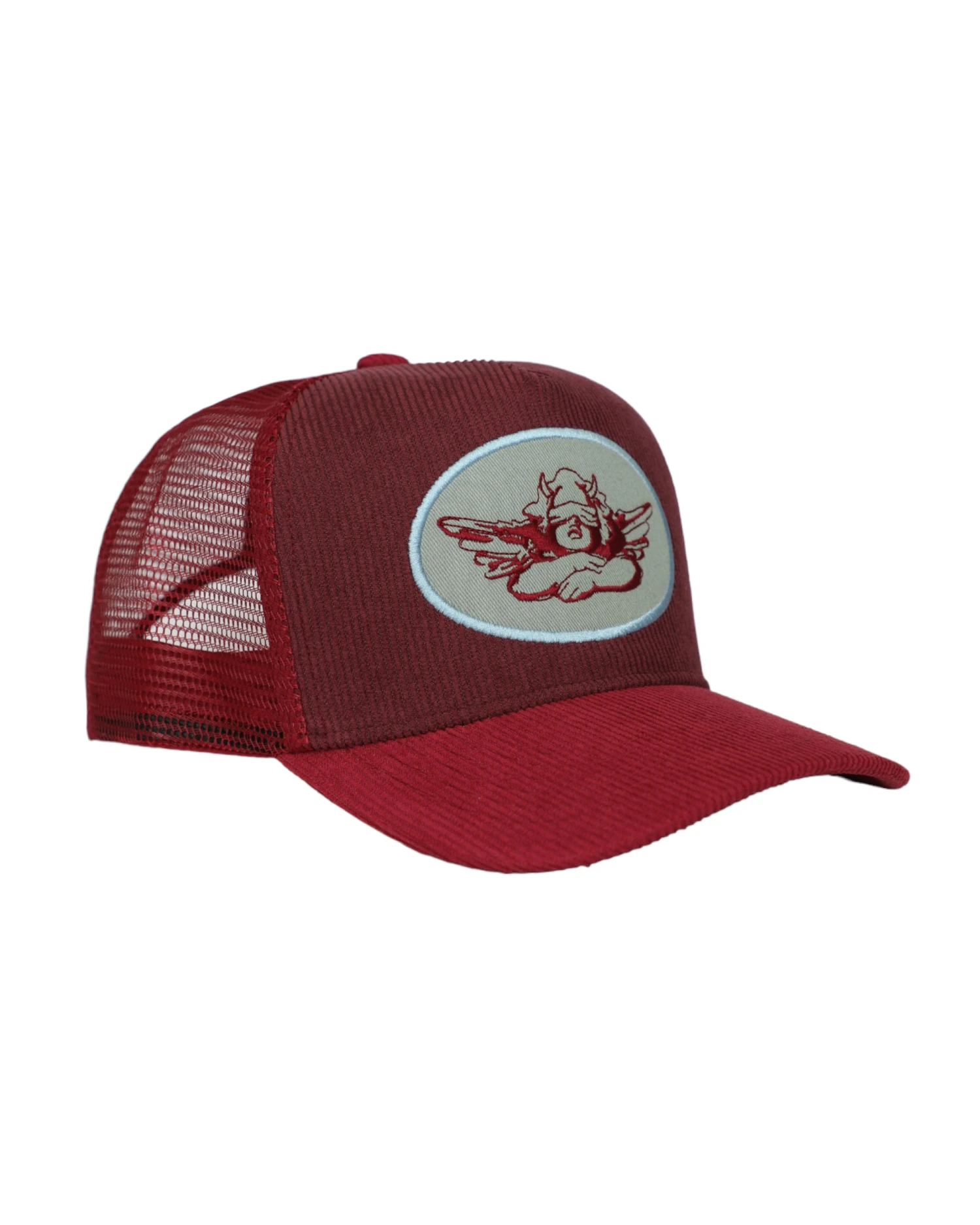 Maroon corduroy trucker hat with a blue patch and red brim. Adjustable snapback.Â