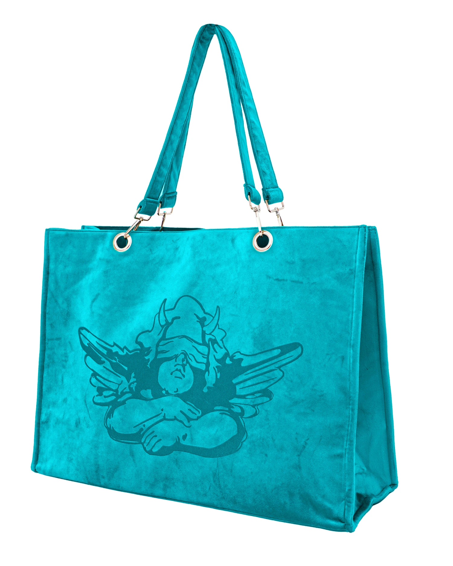 Oversized turquoise velour structured tote. Small interior pocket, silver hardware, and magnetic closure.Â