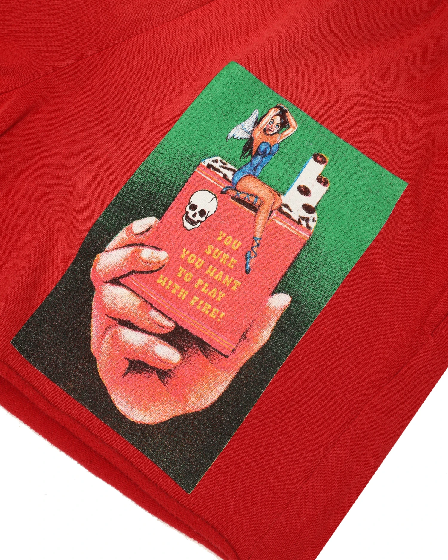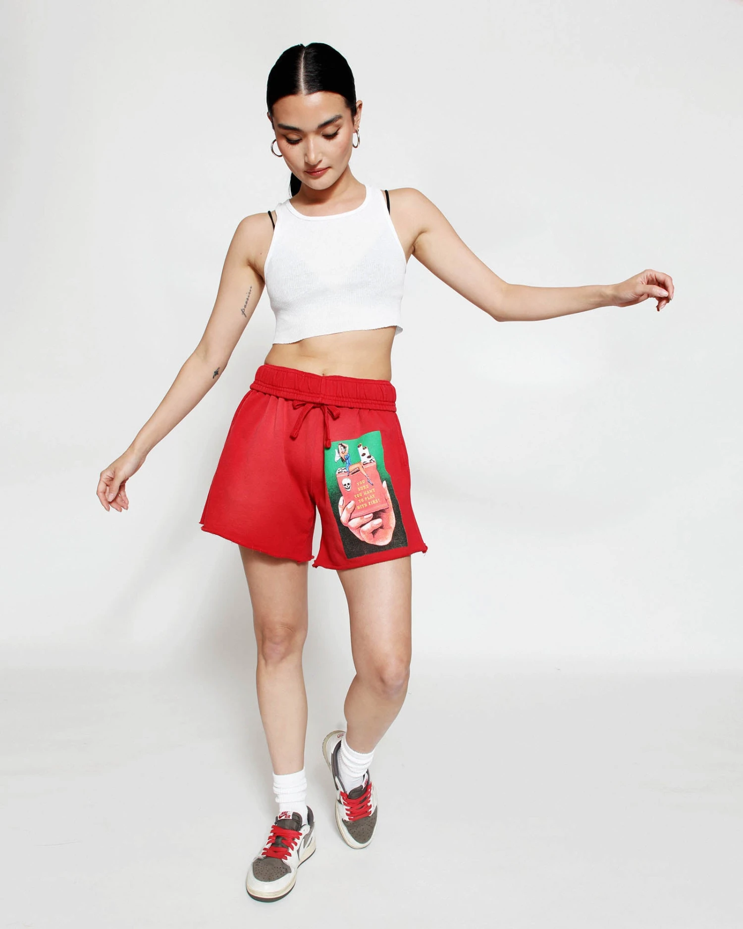 Lightweight french terry fabric in red with potassium dye. High-rise shorts with thick waistband, adjustable drawstring, side pockets, and raw edge hem. Features puff print detail.