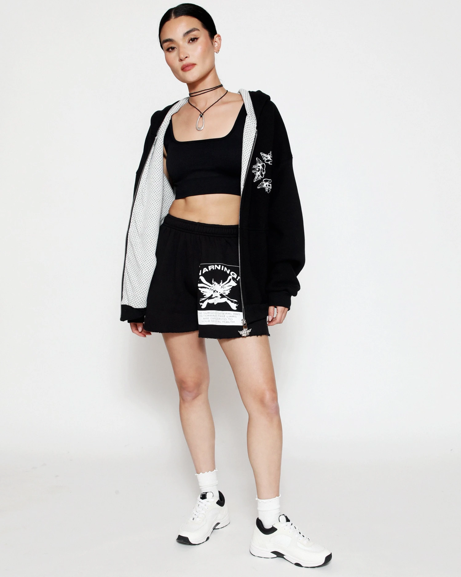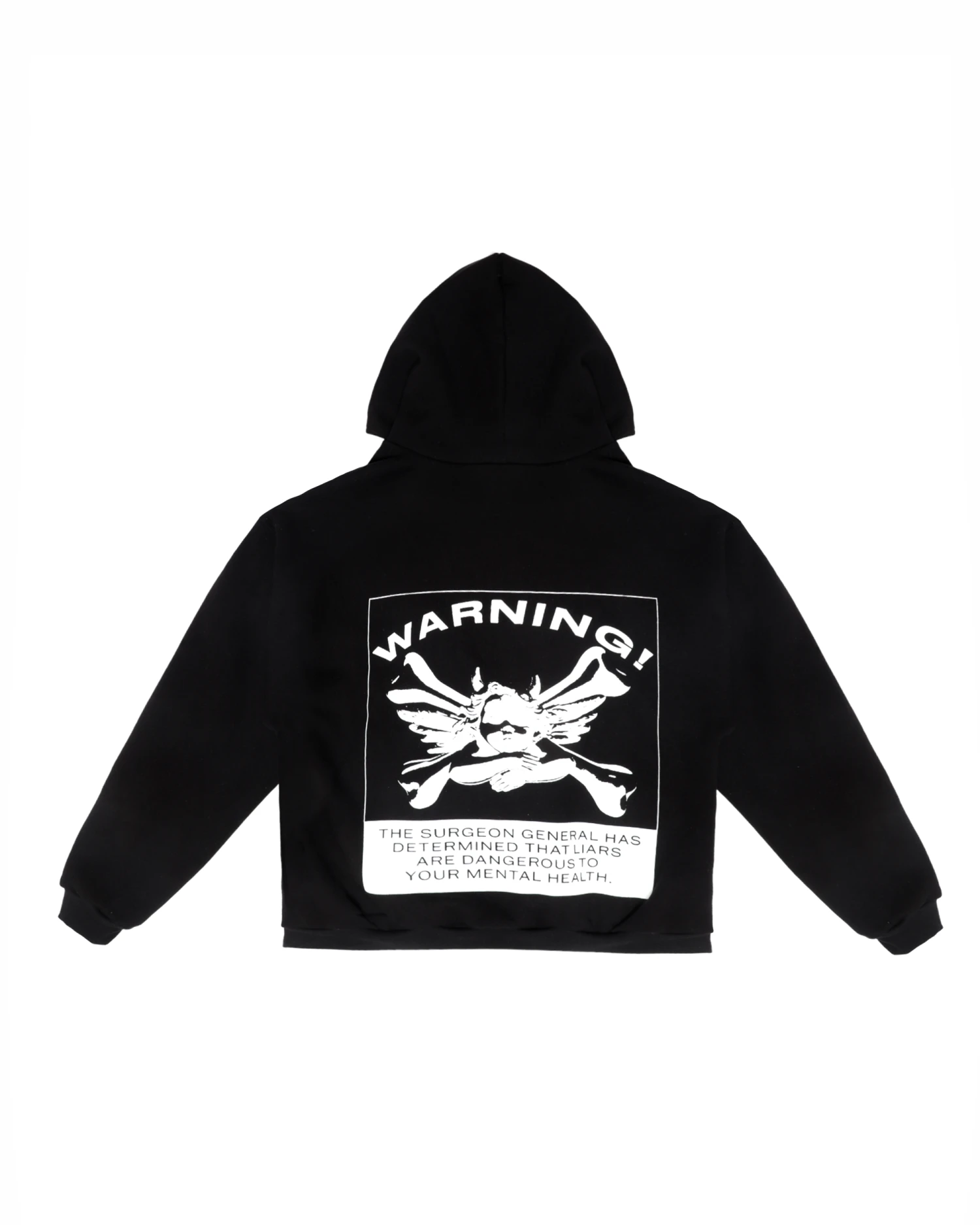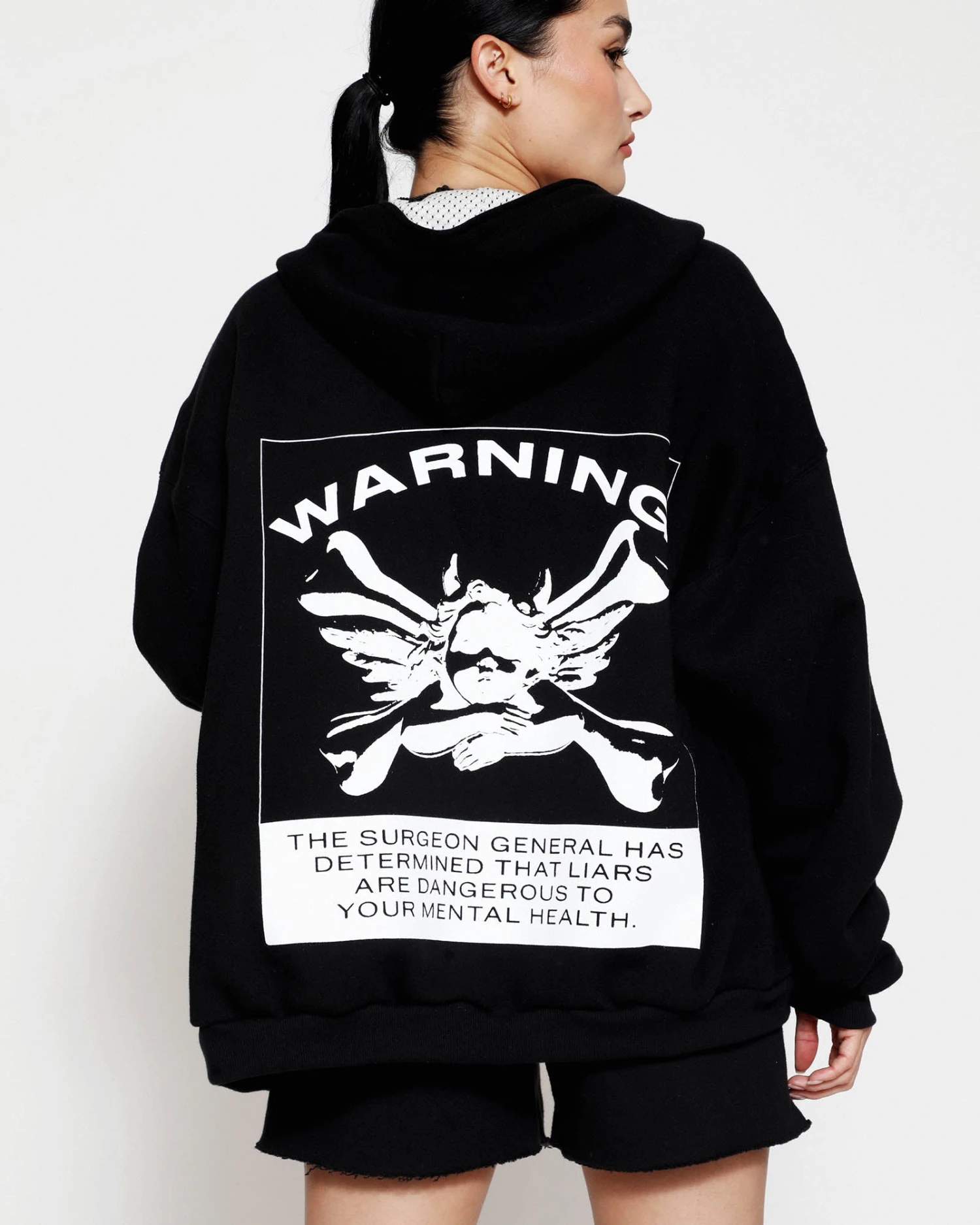 Fleece fabric in black. Oversized zip up hoodie with inside lining, front pockets, and ribbed cuffs. Features extra large Boys Lie logo zipper pull and embroidered logos.