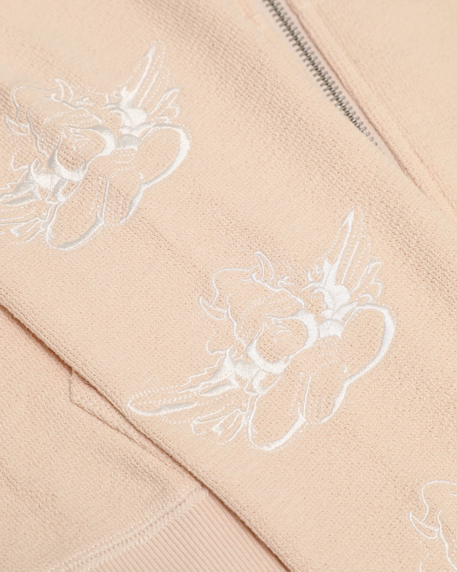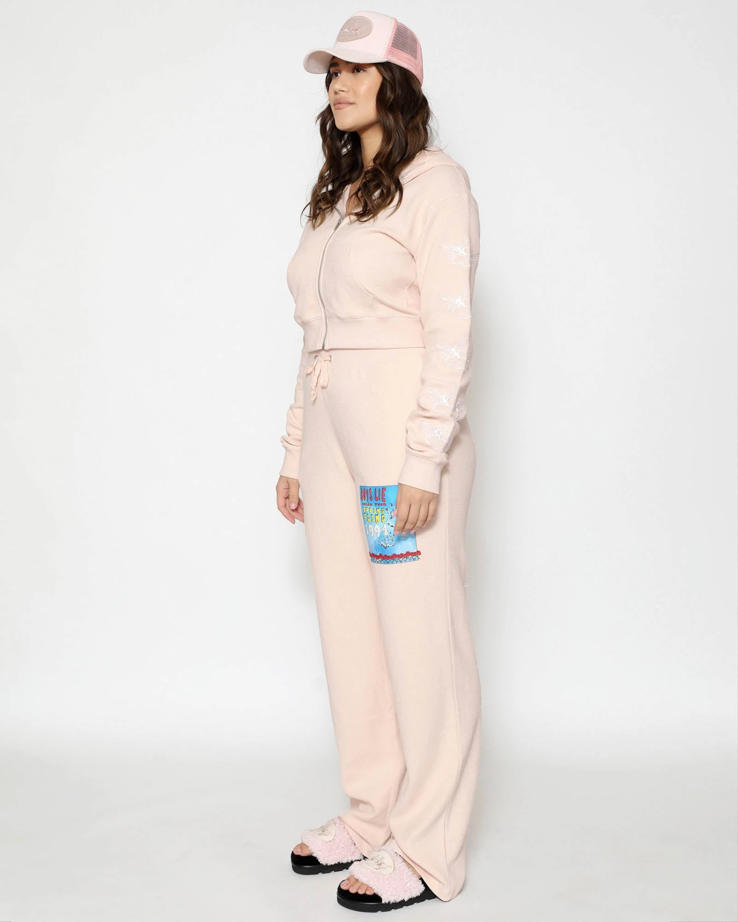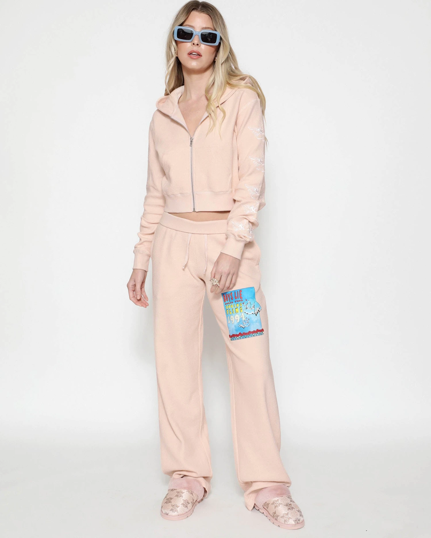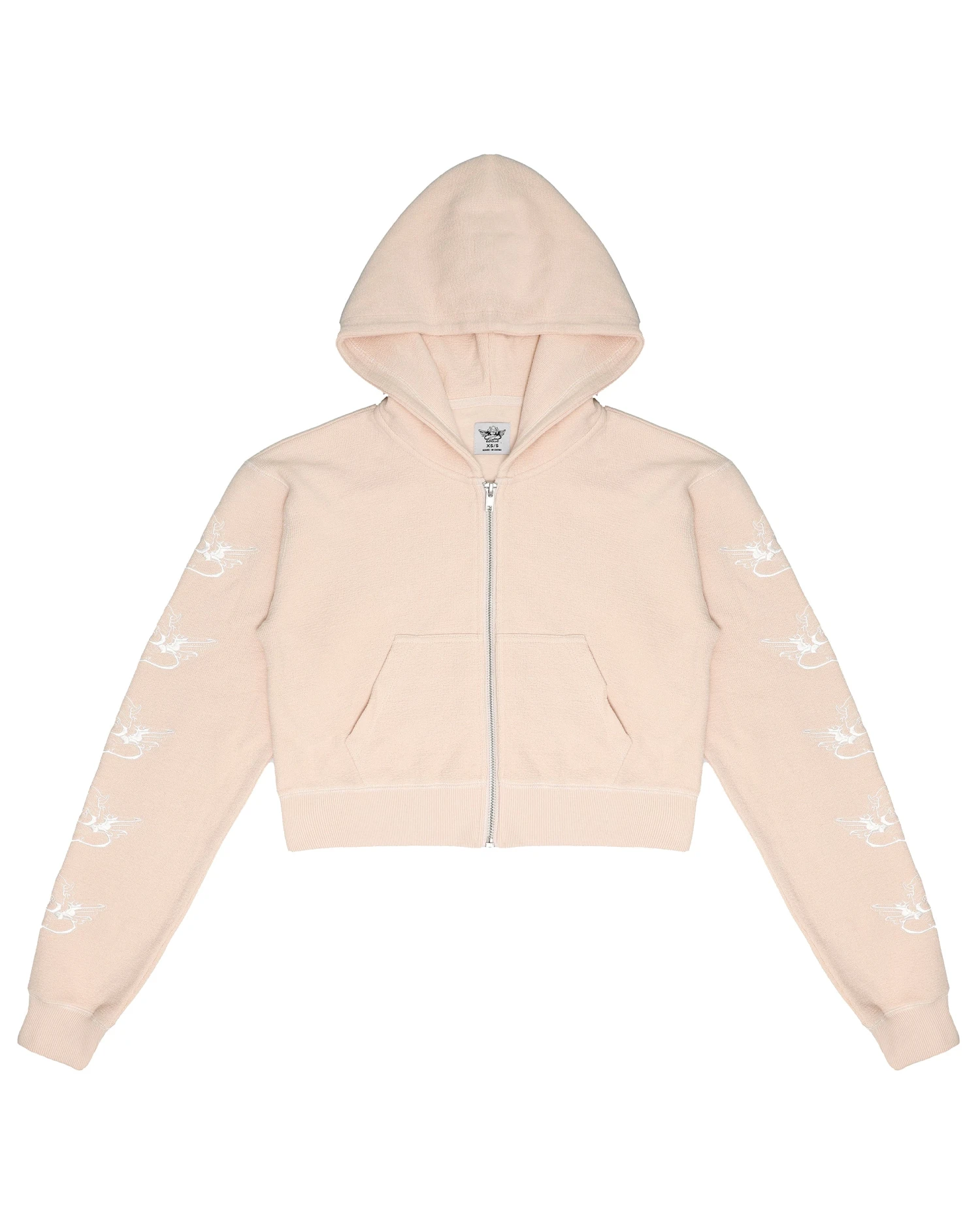 Lightweight inside out french terry fabric in a soft pink. Zip up hoodie with cropped hem, front pockets, and ribbed cuffs. Features embroidery on the sleeves.Â