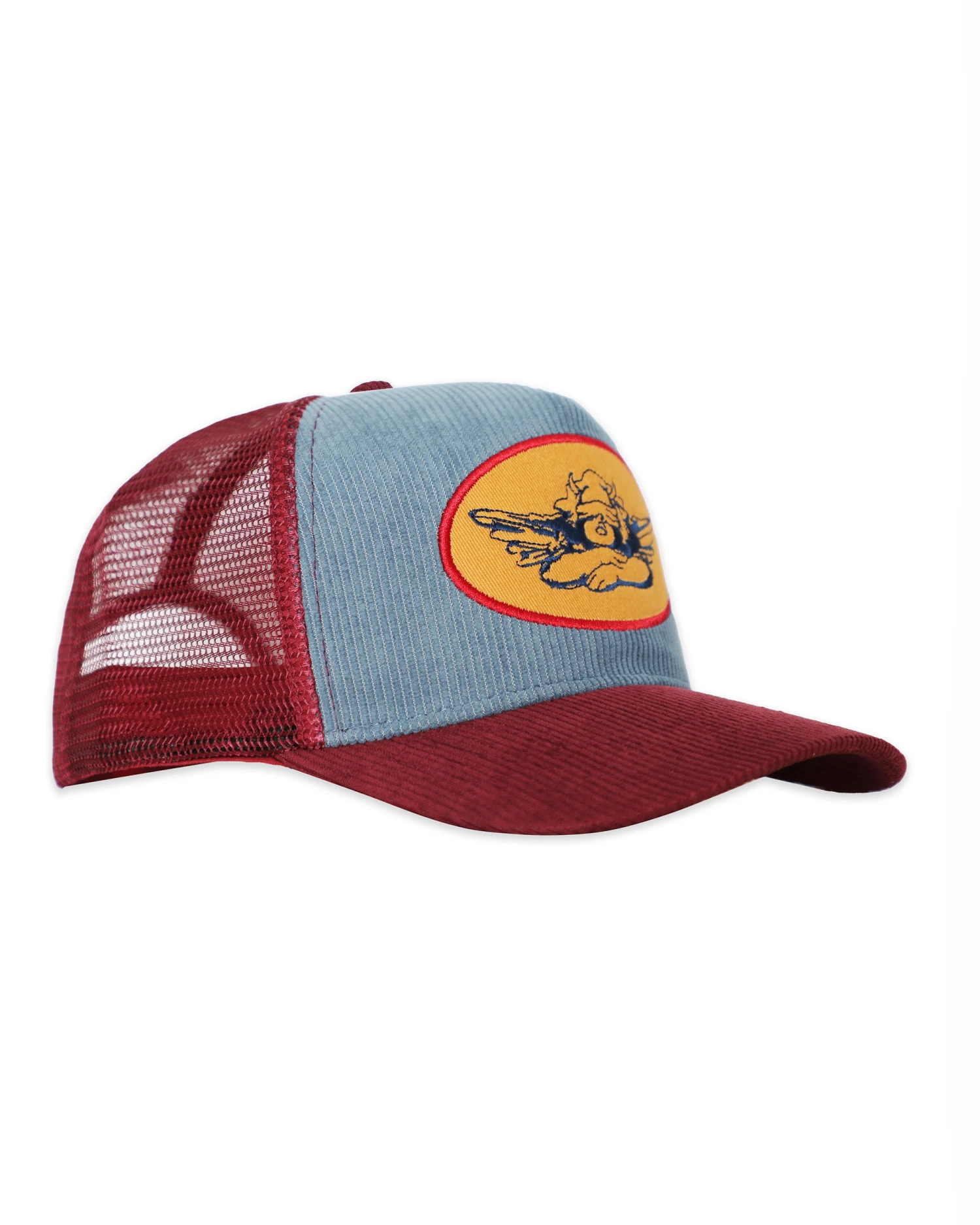 Maroon trucker hat with mustard yellow patch and blue corduroy. Adjustable snapback.Â